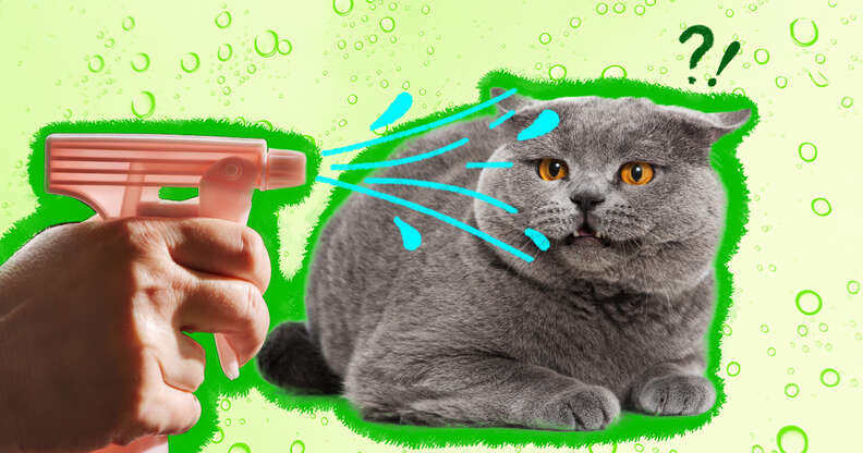 spraying cat with water to train